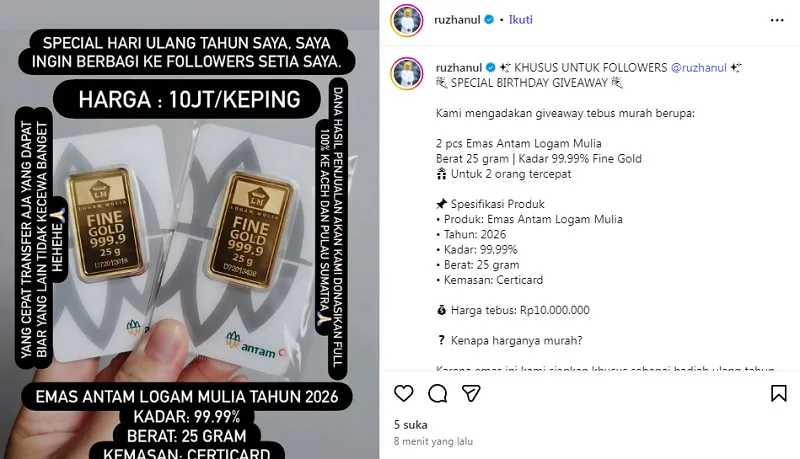 Dalam keterangan (caption) unggahan yang menampilkan gambar emas Antam tersebut, disebutkan bahwa pengikut beruntung akan mendapatkan hadiah berupa dua keping emas Antam Logam Mulia seberat 25 gram untuk dua orang pemenang.