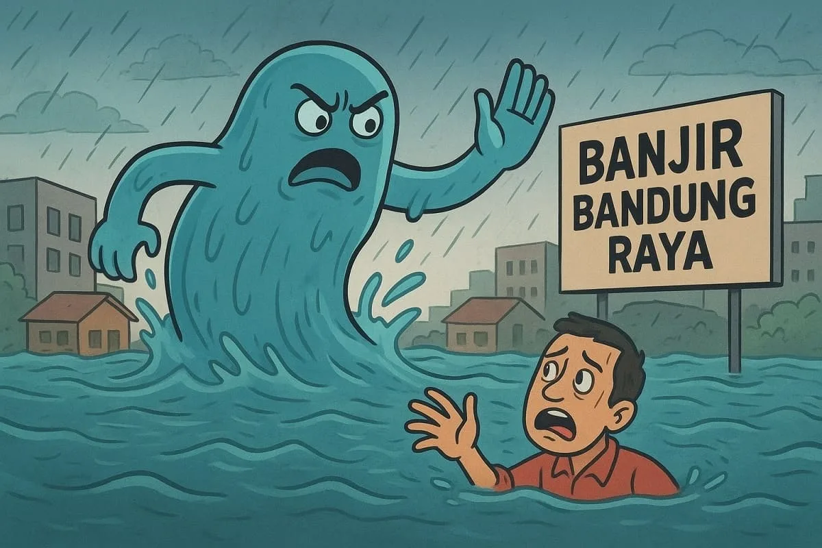 bukamata.id – Hujan yang turun beberapa jam saja kini cukup untuk melumpuhkan Bandung Raya. Air kembali menggenangi permukiman, jalan raya, hingga kawasan pusat aktivitas ekonomi. Di Kabupaten Bandung, kawasan Dayeuhkolot, Baleendah, dan Bojongsoang kembali menjadi titik terparah. Sungai Citarum dan anak-anak sungainya meluap, merendam ribuan rumah warga hingga setinggi pinggang orang dewasa. Aktivitas warga berhenti, sekolah diliburkan, dan kerugian material kembali tak terhindarkan.
