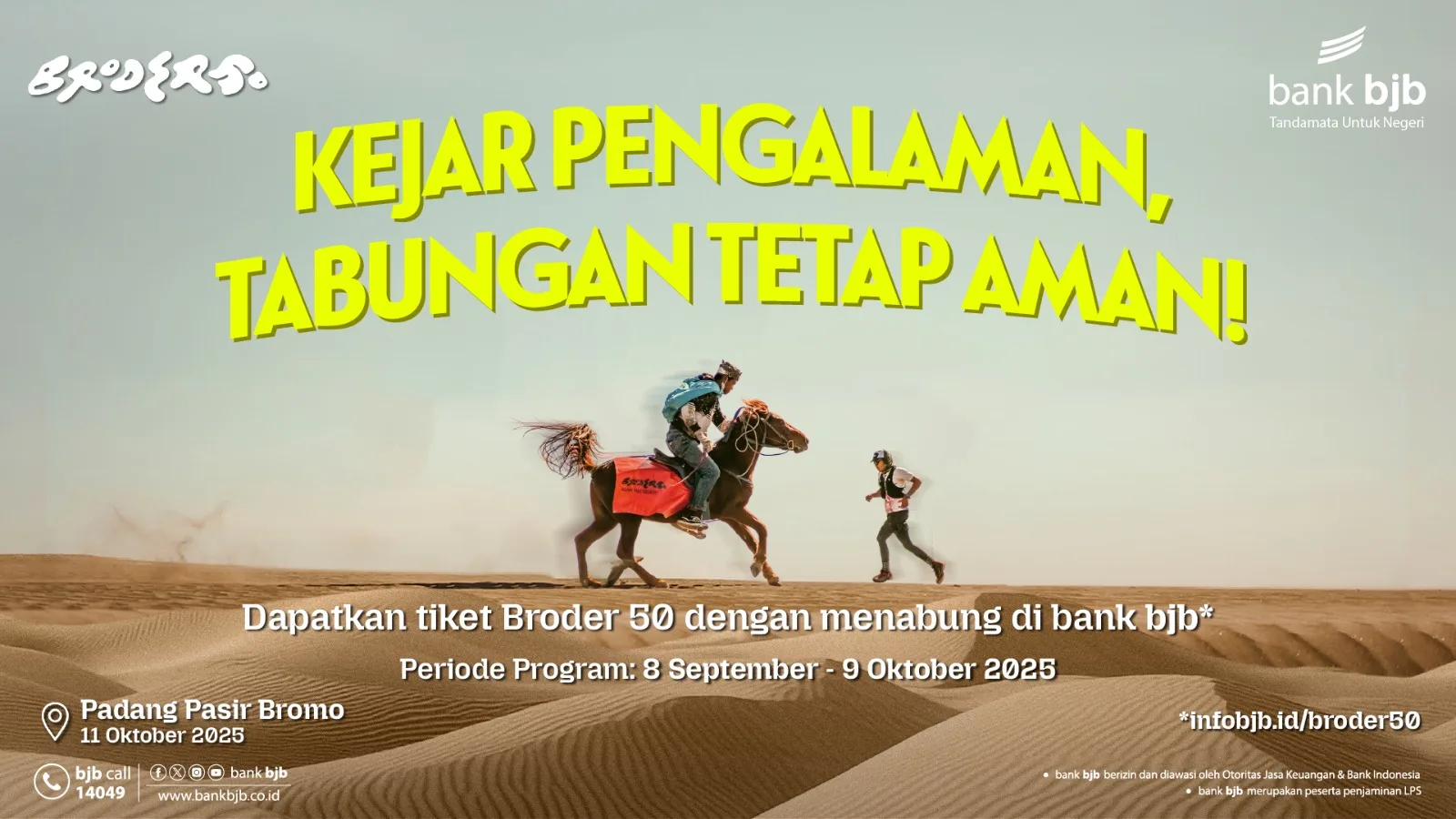 Dikenal sebagai salah satu lomba lari paling menantang di Indonesia, BRODER50 menawarkan pengalaman unik berlari di padang pasir dengan panorama indah sekaligus medan ekstrem. Melalui program ini, bank bjb memberikan kesempatan kepada nasabah untuk menikmati ajang olahraga prestisius sambil tetap berinvestasi melalui produk tabungan.