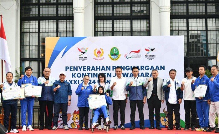Sebagai bentuk penghargaan atas prestasi luar biasa tersebut, Pj Gubernur Jabar, Bey Machmudin menyerahkan penghargaan secara simbolis kepada para atlet, pelatih, ofisial dan kontingen di Plaza Belakang Gedung Sate, Kota Bandung, Selasa (4/2/2025).