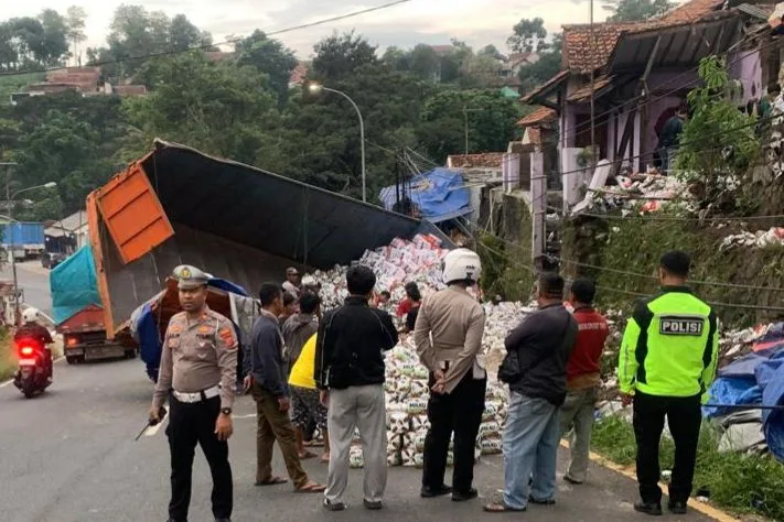Ia menjelaskan, sebagian muatan berupa air mineral dan susu cair tumpah di lokasi kejadian, sementara sebagian lainnya masih berada di dalam kendaraan.