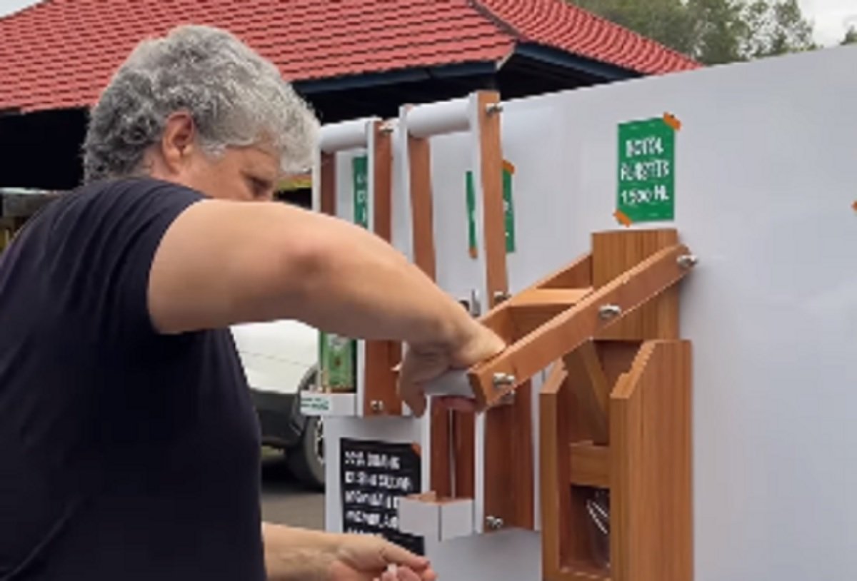 Konsepnya adalah ekonomi sirkuler. Cahyono memanfaatkan potongan-potongan limbah kayu berkualitas untuk dirakit menjadi alat pengepres manual. Alat ini dirancang sangat ergonomis; cukup dengan menarik tuas kayu, sebuah botol plastik berukuran 1.500 ml bisa mengerut hingga ukuran terkecil dalam hitungan detik.