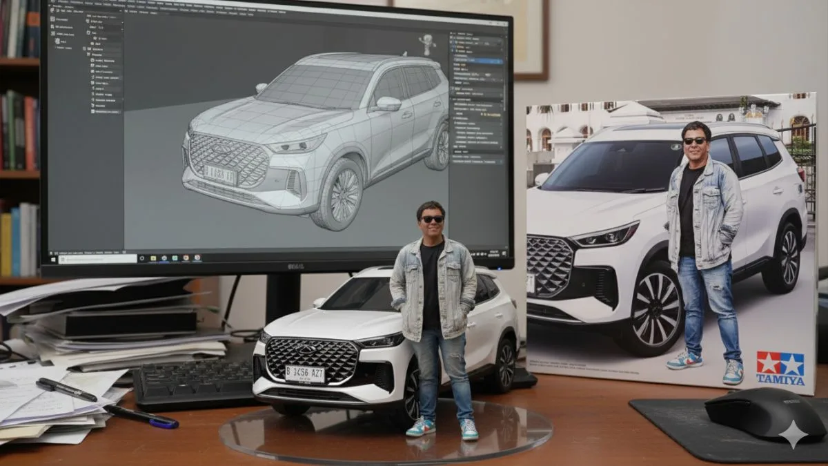 - Mobil: “Ubah mobil jadi figurin 1/18 detail, letakkan di meja kerja dengan kotak kemasan gaya Tamiya di sampingnya.”