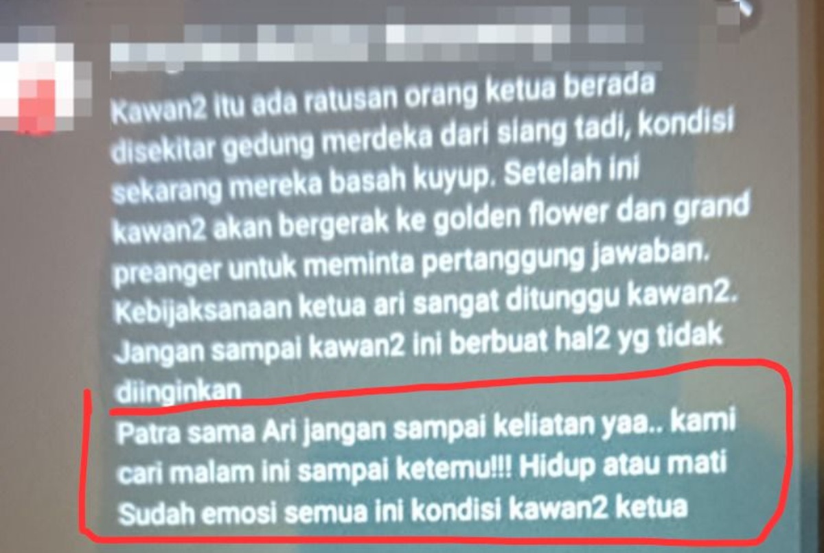 Ancaman serupa kembali dilontarkan oleh peserta lainnya. “Jangan sampai kawan-kawan berbuat hal-hal yang tidak diinginkan,” demikian bunyi pesan tersebut.