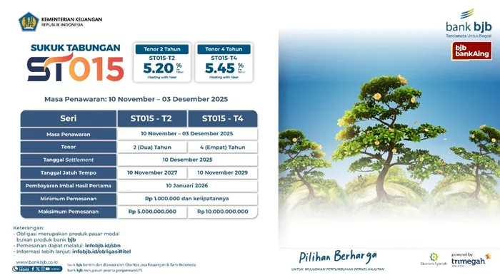Produk investasi ritel yang diterbitkan pemerintah ini resmi ditawarkan sejak 10 November–3 Desember 2025. ST015 menjadi pilihan menarik bagi masyarakat yang menginginkan investasi terjangkau sekaligus berkontribusi pada pembangunan negara.