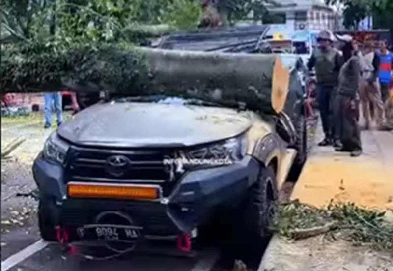 Insiden terjadi tepat di perempatan Jalan Skanda dan Jalan Gelap Nyawang, menimpa satu unit mobil Hi-Lux yang sedang terparkir di lokasi.