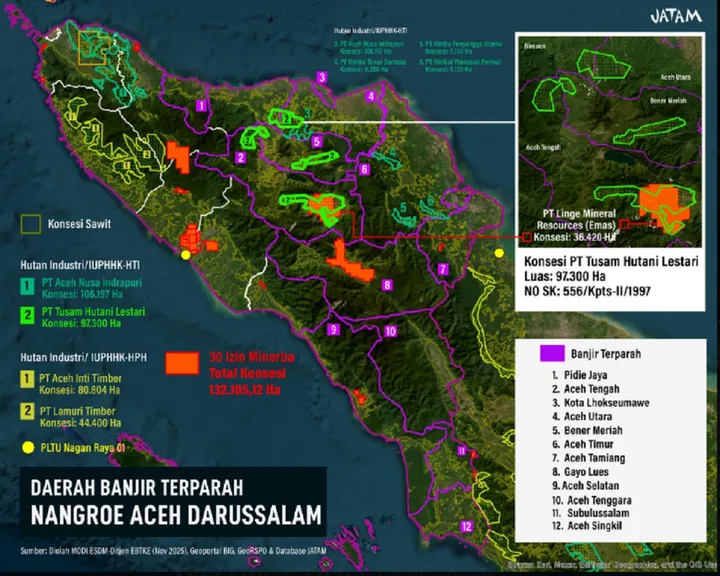 Jaringan Advokasi Tambang (Jatam) membagikan peta melalui akun X @jatamnas yang memperlihatkan wilayah banjir parah di Aceh. Peta itu menunjukkan sebagian area terdampak banjir berada dalam konsesi PT Tusam Hutani Lestari.