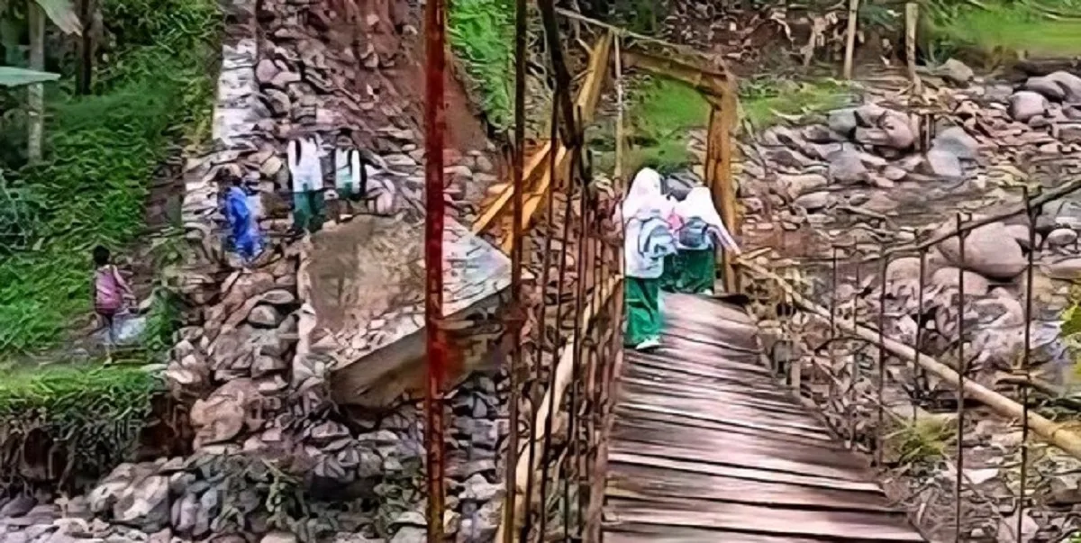 Dalam sebuah rekaman video yang ramai beredar di media sosial, tampak sejumlah pelajar berseragam hijau-putih berjalan perlahan di atas jembatan yang miring. Mereka berpegangan erat pada kabel sambil melangkah hati-hati. Dari kejauhan, warga terlihat memantau dengan raut cemas.