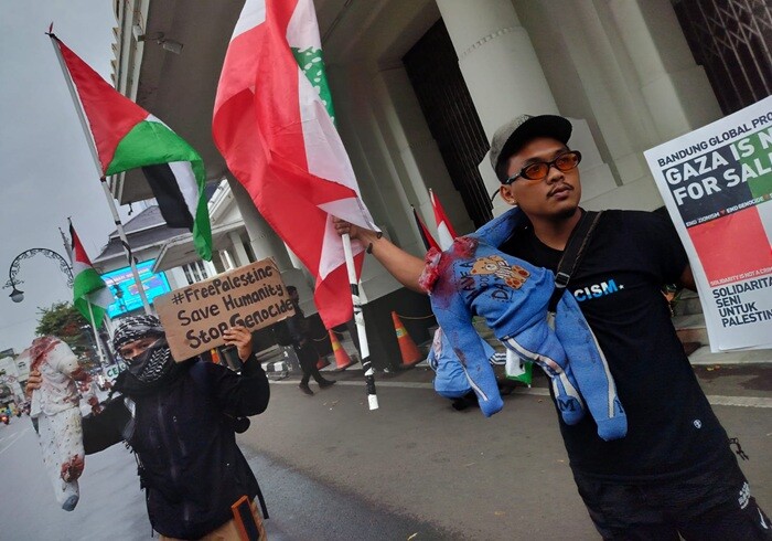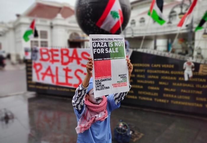 Bertepatan dengan Bandung Global Protest, seniman dan aktivis yang tergabung dalam Solidaritas Seni untuk Palestina turun ke jalan menyuarakan dukungan bagi rakyat Palestina.