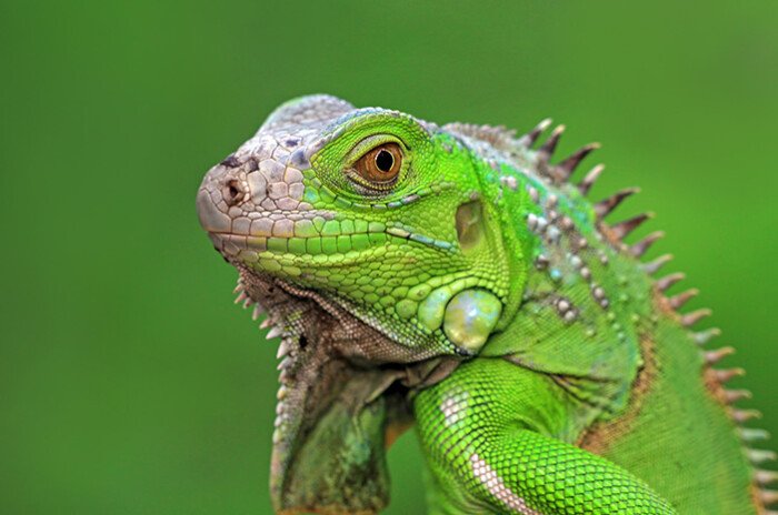 Iguana hijau sebagian besar berasal dari Amerika Tengah dan Karibia, mereka tidak agresif meskipun memiliki ekor dan rahang yang tajam serta gigi setajam silet. Reptil ini hidup dengan memakan buah-buahan, daun-daunan, dan tanaman, dengan sesekali memakan hewan kecil.